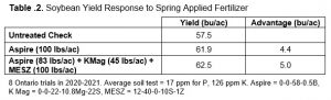 Potassium (K) deficiency was widespread again this year. K deficient leaves turn yellow along the leaf margins. A soil test is the only reliable way to know if a field is truly low in K or only showing stress-induced K deficiencies. It’s also important to note that K deficiency symptoms may indicate soybean cyst nematode (SCN) feeding on the roots. Spring fertilizer application when soil tests are insufficient often provide a 4-5 bu/ac yield response (See Table 2.)