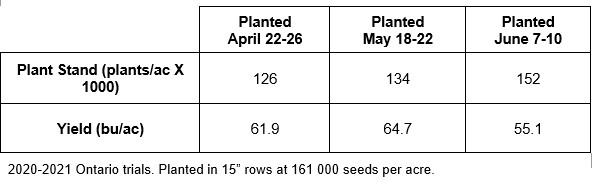 A small percentage of the crop was planted in April, but many soybeans were planted in the typical mid-May planting window. There has been a trend in Ontario for some growers to plant soybeans before corn. Although planting early often produces higher soybean yields, recent Ontario trials have shown that ultra-early planted soybeans do not necessarily yield better than May planted soybeans. June planted beans usually yield significantly less (See Table 1.).