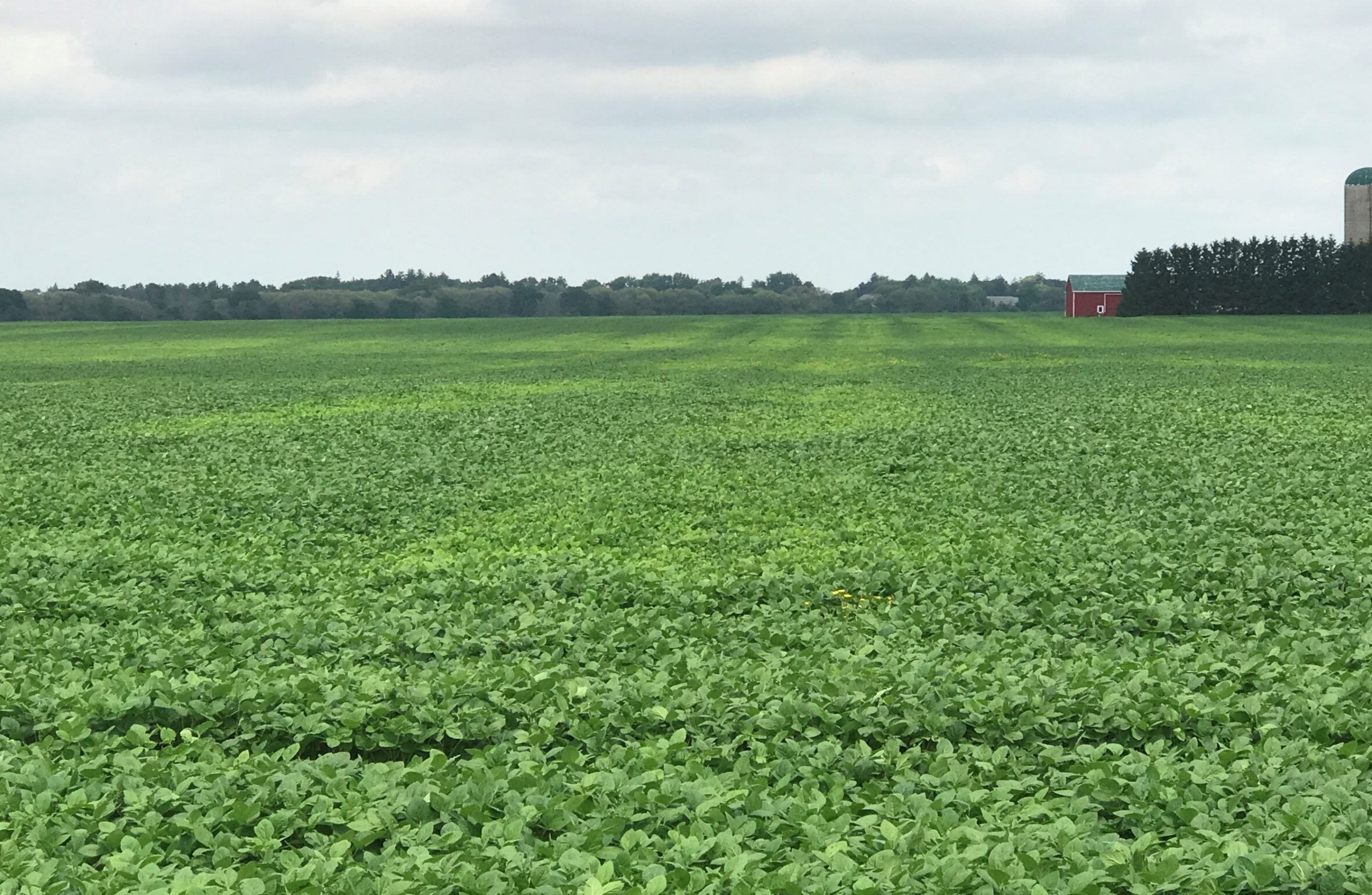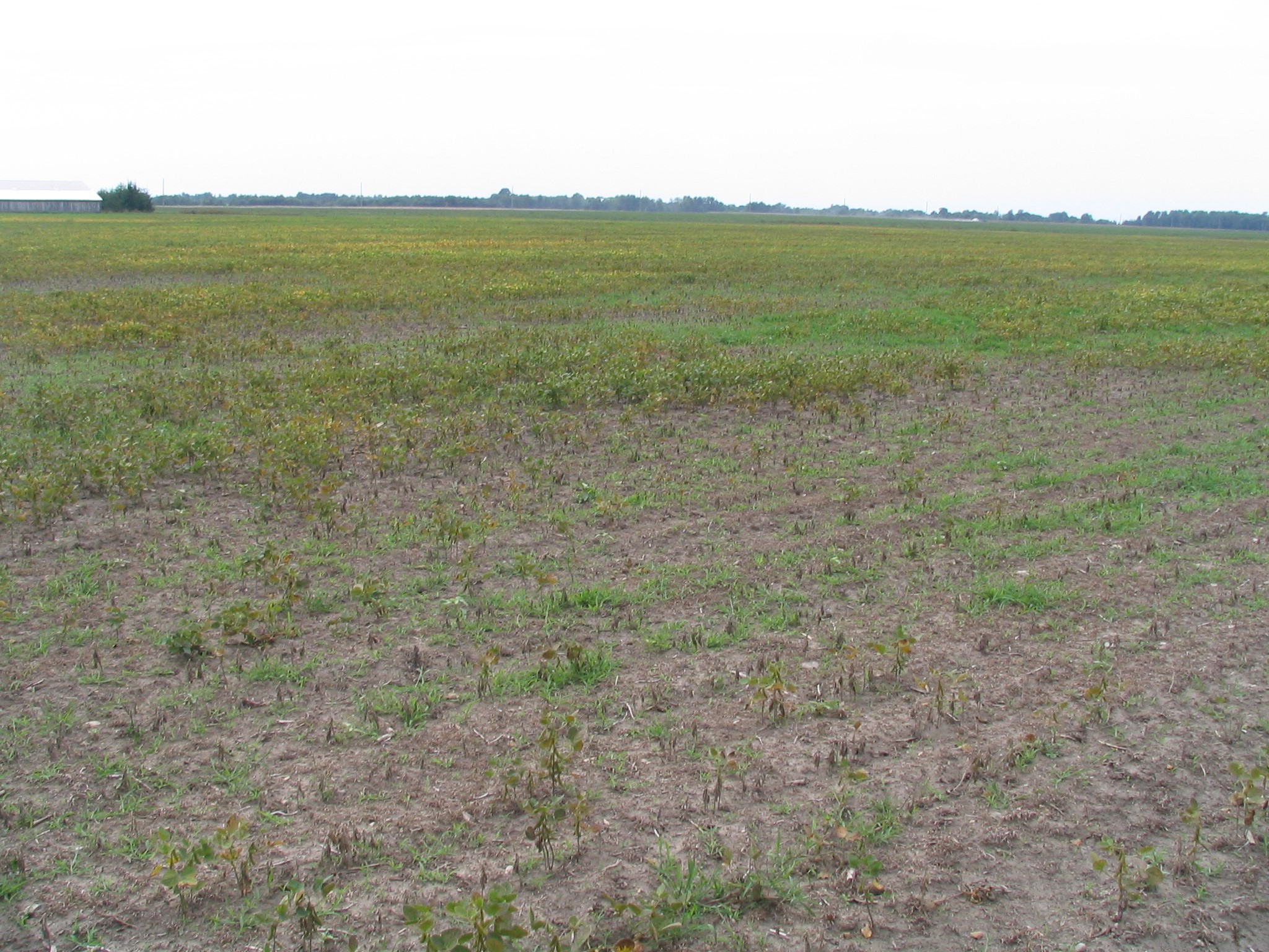 Excess rainfall turned fields yellow in early July. The fact that tile runs were so evident in water-logged fields was clear evidence that this problem was caused by a nitrogen deficiency (see Figure .2). Another factor that added to this N deficiency is that soybeans were in their rapid growth phase, attempting to quickly put on tri-foliates while flowering was in full swing. This rapid growth requires a lot of nitrogen.