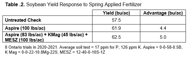 Potassium (K) deficiency was widespread again this year. K deficient leaves turn yellow along the leaf margins. A soil test is the only reliable way to know if a field is truly low in K or only showing stress-induced K deficiencies. It’s also important to note that K deficiency symptoms may indicate soybean cyst nematode (SCN) feeding on the roots. Spring fertilizer application when soil tests are insufficient often provide a 4-5 bu/ac yield response (See Table 2.)