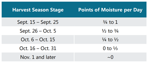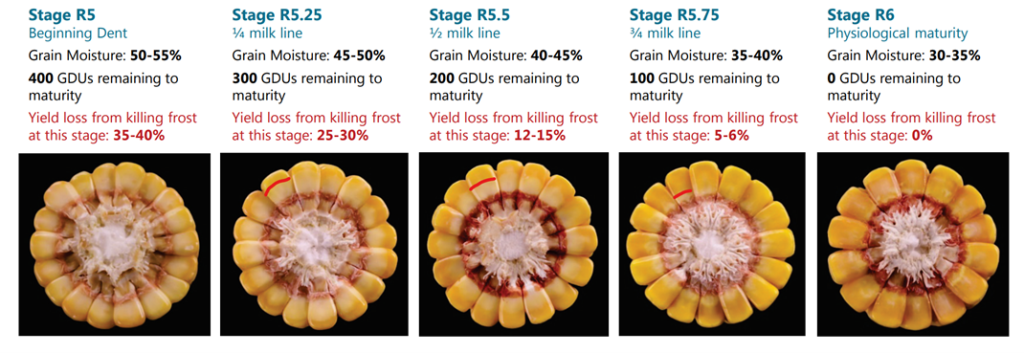Even though there is nothing we can do to control the weather patterns during the season, we can at least understand how the plants are maturing and how much we can expect grain moistures to change week to week. It was the end of August before we were consistently finding dented kernels (R5) and a general rule of thumb is that it will take 7-10 days to mature between each stage on the image above. Once we hit physiological maturity (R6) and can find black layer, the moisture of the grain will range from 30-35% and further dry down is all based on moisture evaporating from the kernels.