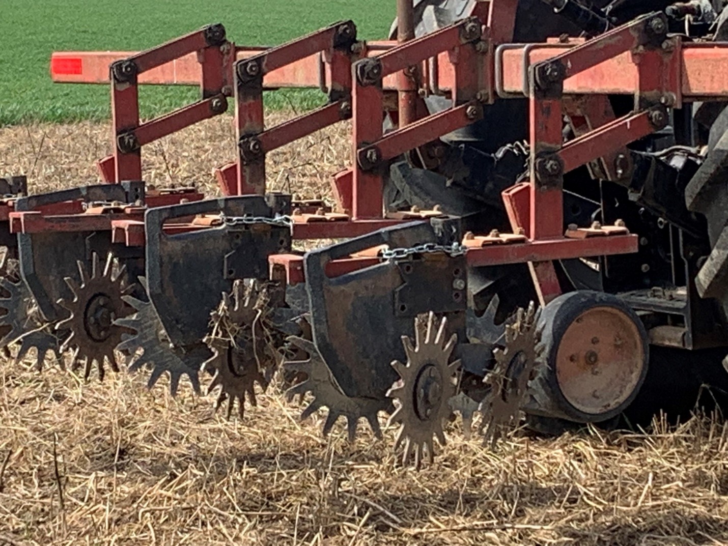 Farming on a dime, Nick is proving that the technology behind the science does not need to be expensive. Aside from RTK autosteer, he has taken the Frugal Farmer Approach by cobbling together old parts laying around the farm to create his biostrip till row cleaner unit. With Yetter finger wheel row cleaners that have been sitting in the barn since converting to no till in the 1990s, Nick attached them to an old cultivator he found in the back corner of a neighbour’s shed and with the ‘magic of welding 101’, created his row cleaner unit.