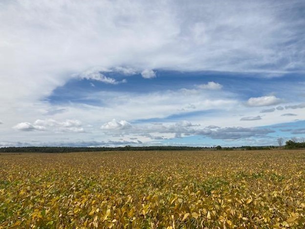 Photo credit: Kelsey Banks, September 15, 2021. One of the ONFARM fields of Soybeans near Douglas, Ontario dropping leaves pre-harvest.