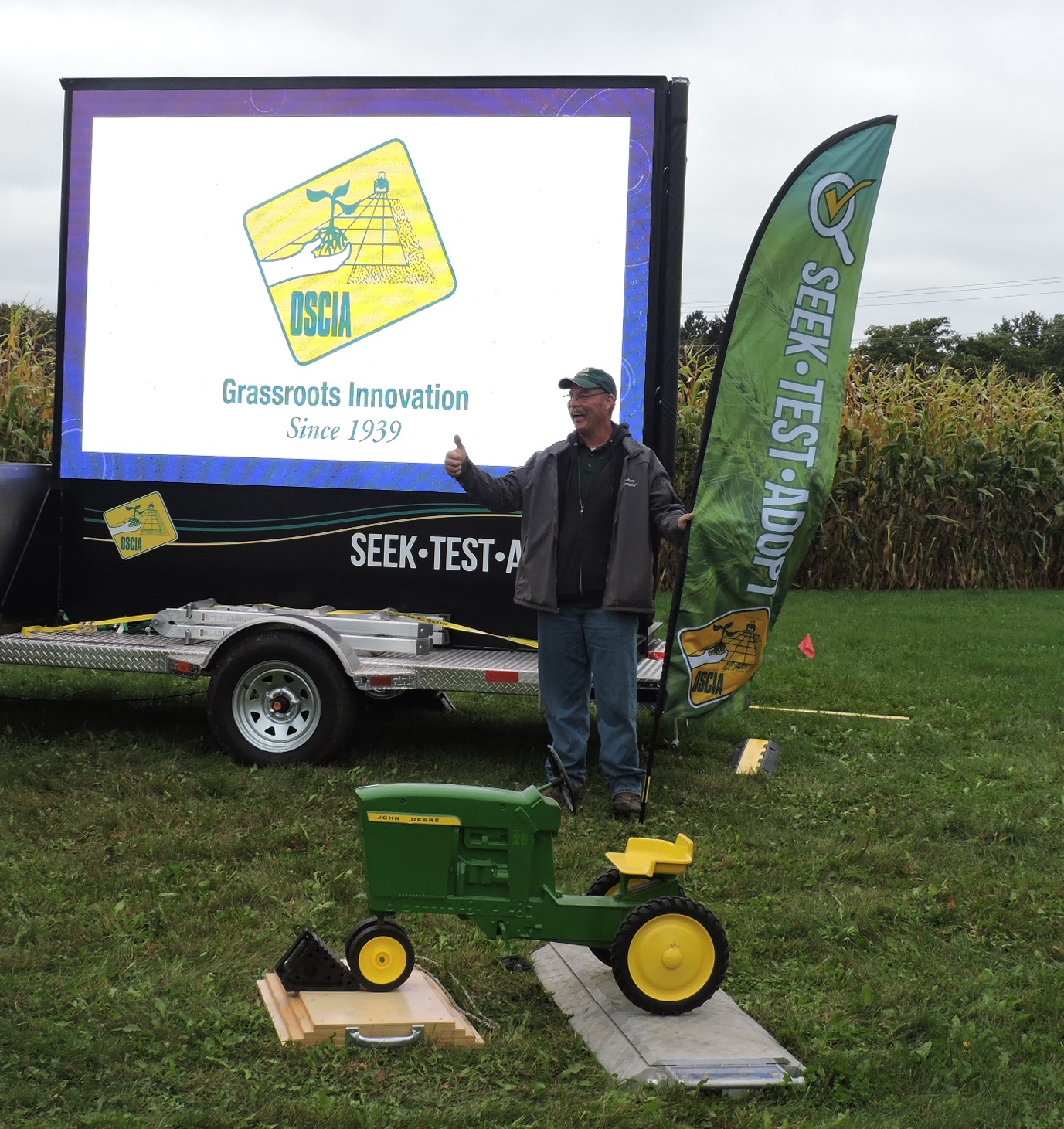 Photo courtesy of OSCIA. 2021 OSCIA President, Chad Anderson, showing his enthusiastic approval of the MSTS trailer at Crop Stop event.