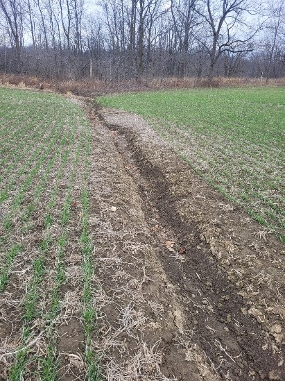 A landowner in Brooke-Alvinston with rolling farmland, reached out to St. Clair Conservation for information and advice regarding the multiple gullies in his farm fields. After securing an OMAFRA-certified Erosion Control Contractor to design and implement the project, St. Clair obtained funding from Ducks Unlimited Canada, OMAFRA, and other sources, to cover 75% of the project. In an effort to reduce soil erosion and capture overland runoff, 17 Water and Sediment Control Basins (WASCoBs) and 3 wetlands (totalling ~1.25 acres) were created on a 100-acre parcel of farmland. WASCoBs can help with reducing gullying in farm fields by slowing the velocity of overland runoff in heavy precipitation events. Depending on the severity of the slope, WASCoBs can be designed to be broad-based, or farmable. Wetlands can also slow overland flow and reduce sediment and nutrients from entering watercourses near farm fields. If you are interested in in addressing gullies in your farm fields or implementing other green infrastructure, reach out to your local Conservation Authority contact and we’ll be able to provide some direction on available grant funding, potential contractors and project design. The picture on the right is an example of one the many gullies in this 100-acre farm field.