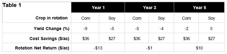 The report by the Greenbelt Foundation determined that when profitability is measured over a period of 5 years rather than any one single year, the economic benefits of reduced tillage are more fully realized (Table 1). This allows for the different ways that individual crops respond to reduced tillage to average out through the rotations.