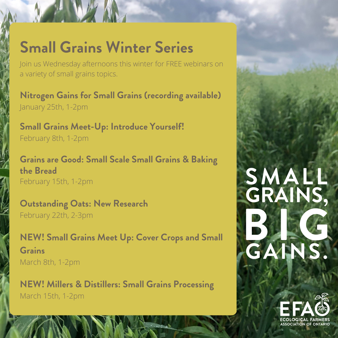 | We asked and you answered – you want to talk about small grains in your small grains crop rotations! Come on out for a conversational, discussion-based hour with other farmers interested in cover cropping with their small grains. Join EFAO on March 8 from 1-2pm to join in. Brett Israel of 3Gen Organics will be there to kick off our discussion! 3Gen Organics is a multigenerational family farm in Wallenstein, Ontario, where they grow 540 acres of corn, soybeans, small grains and hay crops to fuel their organic pork production. Brett and his family are innovators determined to continue to improve their rotations, and one tool they use is cover crops! We’ll be inspired by 3Gen & then dive into all of our collective cover crop challenges. Tune in to share your own cover cropping experiences, ask questions and discuss solutions. Whether you’ve been growing grains for 50 years or you’re still looking for the perfect piece of land, you’re welcome to come and see what we can learn together. This event is an OSCIA-recognized Knowledge Sharing Event for Ontario On-Farm Climate Action Fund (OFCAF) applicants with a project under the Cover Cropping category. Register online: https://efao.ca/event/small-grains-meet-up-cover-crops-and-small-grains/ |