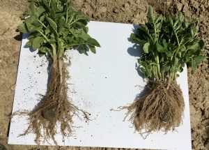 A comparison of the root development of inoculated potatoes (right) versus non-inoculated (left)