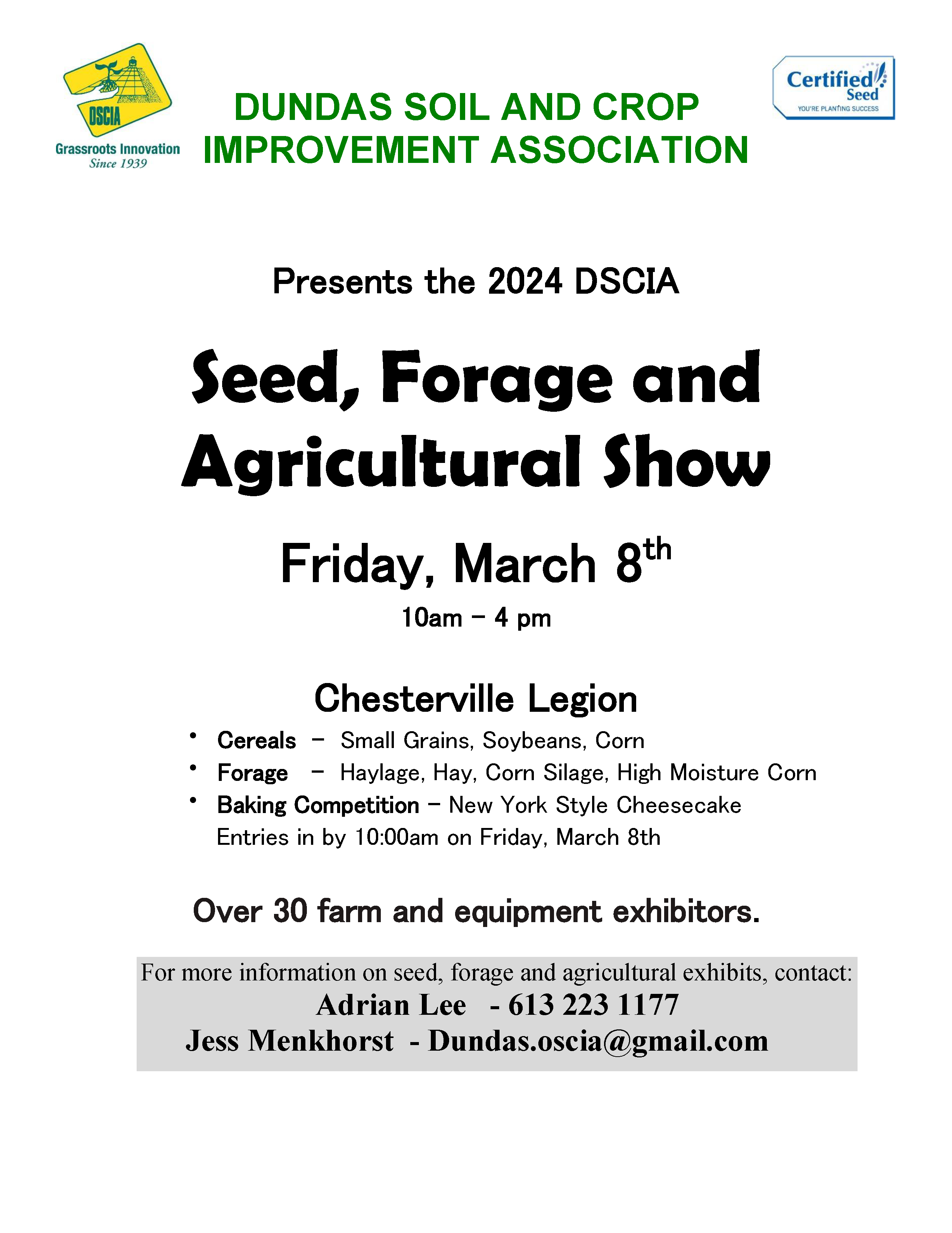 « All Events This event has passed. 2024 Dundas SCIA Seed, Forage and Agricultural Show March 8, 2024 @ 10:00 am - 4:00 pm « Frontenac Hay and Seed Show Manure Application Logistics and Field Strategies (Virtual) » Add to calendar Google Calendar iCalendar Outlook 365 Outlook Live Details Date: March 8, 2024 Time: 10:00 am - 4:00 pm Event Categories: Association, Dundas, Event