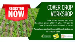 « All Events This event has passed. Cover Crop Workshop January 26, 2024 @ 9:30 am - 12:00 pm « Brant Winter Meeting & AGM Haldimand AGM » To register, contact Hope at hbrock@abca.ca or 519-235-2610. Add to calendar Google Calendar iCalendar Outlook 365 Outlook Live Details Date: January 26, 2024 Time: 9:30 am - 12:00 pm Event Categories: Cover Cropping, KSE Organizer Ausable Bayfield Conservation Authority Venue Clinton OMAFRA Office 100 Don St Clinton, Ontario N0M 1L0 Canada + Google Map