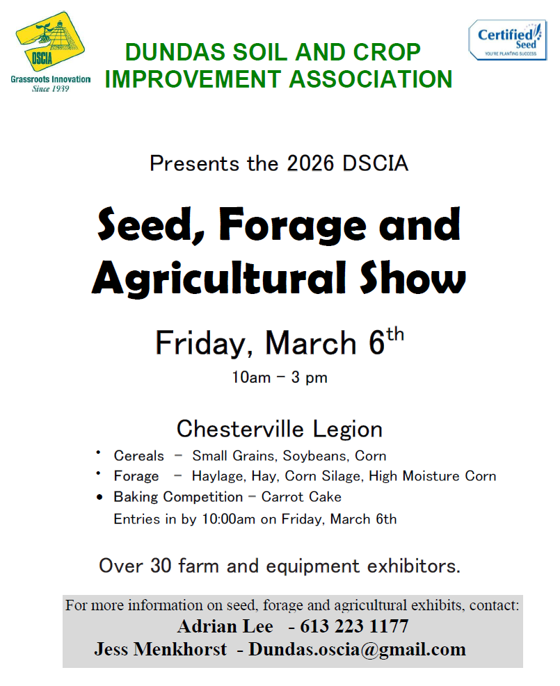 Dundas Soil and Crop Improvement Association would like to invite you to our annual Seed, Forage, and Agriculture Show on Friday, March 6th, 2026 at the Chesterville Legion. Please see the attachments below for more information.  We hope to see you there!