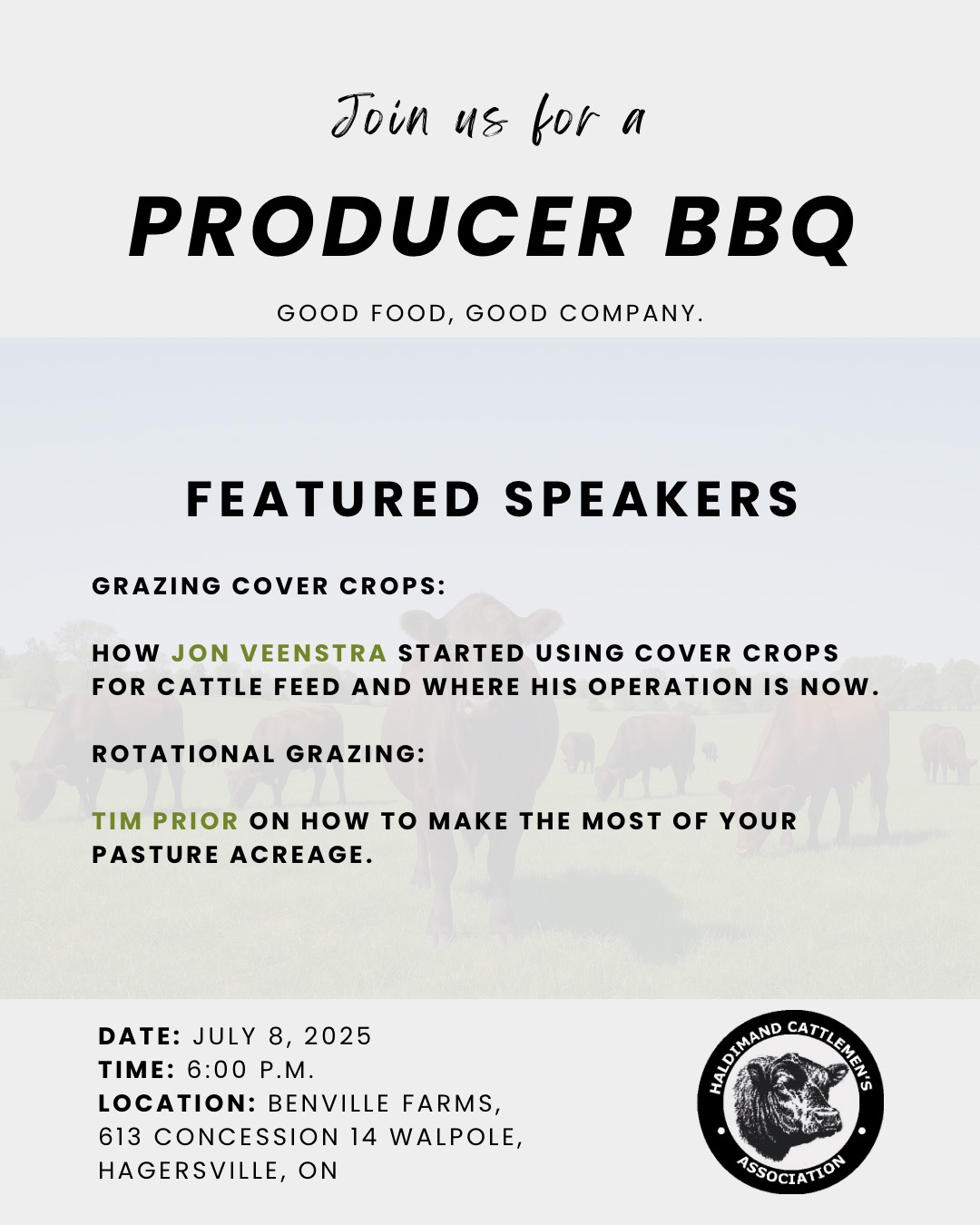 Join Haldimand Cattlemens Association for their Producer BBQ. Featured speakers include Jon Veenstra on using cover crops for cattle feed and where his operation is now and Tim Prior on how to make the most of your pasture acerage.