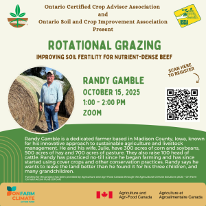 Rotational Grazing: Improving Soil Fertility for Nutrient-Dense Beef is an OSCIA-recognized Knowledge Sharing Event (KSE) for applicants with On-Farm Climate Action Fund (OFCAF) projects in the Rotational Grazing category.