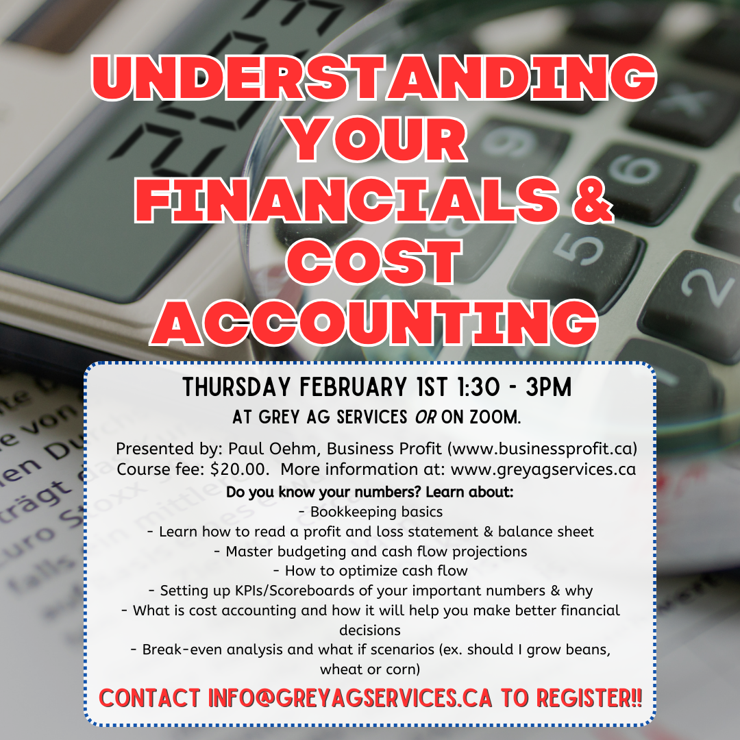 Grey Ag Services 206 Toronto St S, Markdale, Ontario, CanadaDo you know your numbers? Learn about: - Bookkeeping basics - How to read a profit and loss statement & balance sheet - Master budgeting and cash flow projections - How to optimize cash flow - Setting up KPIs/Scoreboards of your important numbers & why - What is cost accounting and how it will help […]