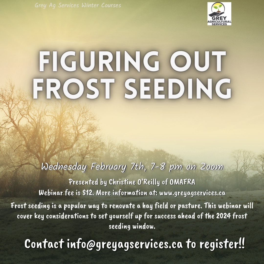OnlineFrost seeding is a popular way to renovate a hay field or pasture. This webinar will cover key considerations to set yourself up for success ahead of the 2024 frost seeding window. Presented by: Christine O'Reilly, Forage & Grazing Specialist at OMAFRA Wednesday February 7th, 2024, 7:00 - 8:00 pm on Zoom. $12. Registration is […]