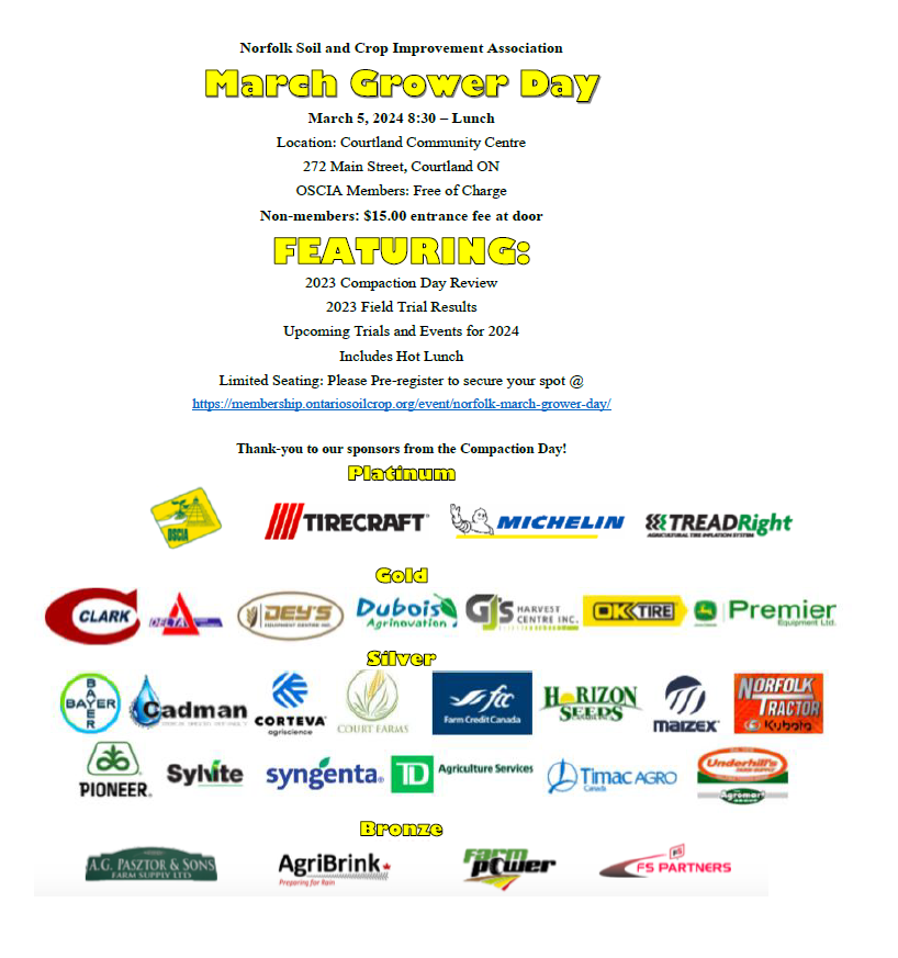 Courtland Community Center 272 Main Street, Courtland, ON, CanadaDiscover the results of the Norfolk Compaction Day in August 2023 as Ian McDonald and Jim Warren discuss the qualities of Norfolk's soils and how they compact. Also learn about the flow of water through our sand soils with Kevin McKague. The 2023 trials data and upcoming cost-share opportunities will also be explored. Limited seating, […]