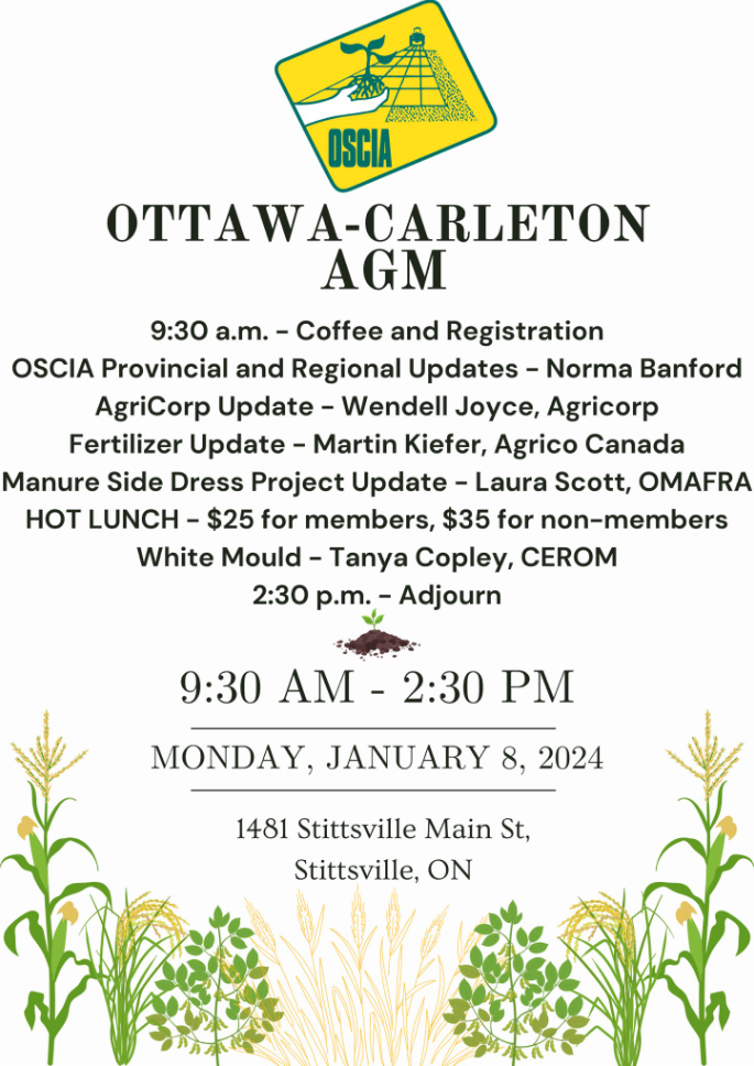 Stittsville Legion 1481 Stittsville Main Street, Stittsville, ON, CanadaJoin the Ottawa-Carleton SCIA AGM! View the agenda below of the event: 10:30- Laura Scott – OMAFRA Update & N Trial Presentation (KSE) (This workshop qualifies for a Nitrogen Management KSE) 11:10 Laura Neil, Reuben Stone & Chris Moore - The Many Cover Crop Opportunities! (This workshop qualifies for a Cover Cropping and Rotational Grazing […]