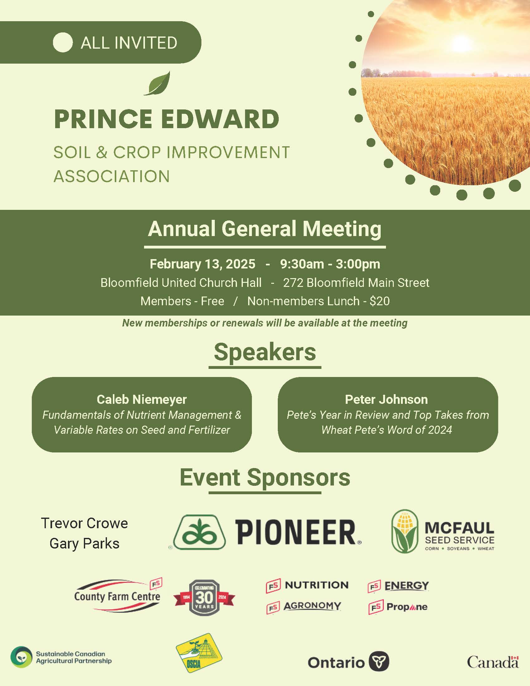 Bloomfield United Church Hall 272 Main Street NULL, Bloomfield, K0K1G0, 9Prince Edward Soil & Crop Improvement Association Annual General Meeting Thursday, February 13, 2025 9:30 a.m. – 3:00 p.m. Bloomfield United Church Hall – 230 Main Street, Bloomfield, ON Members – FREE | Non-members Lunch – $20 New memberships or renewals will be available at the meeting Speakers Caleb Niemeyer – Fundamentals of Nutrient Management […]