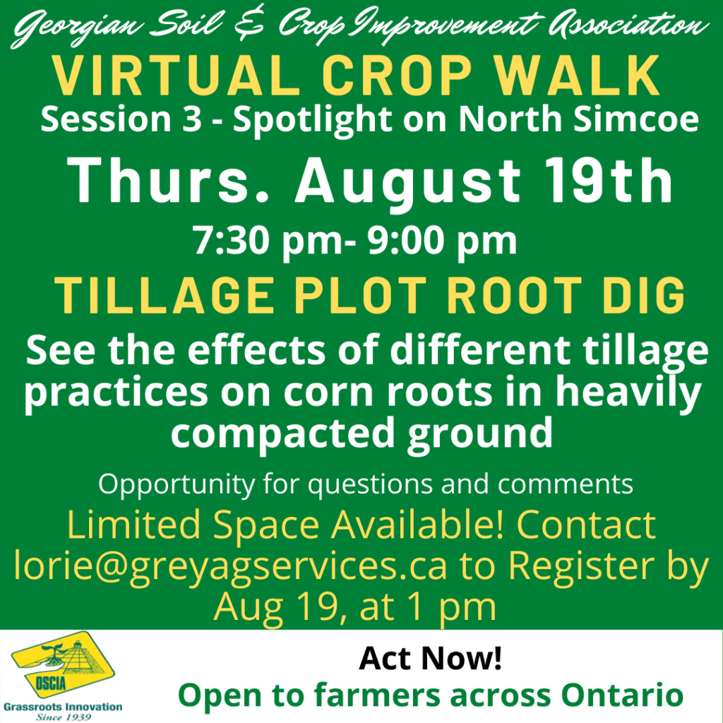 North Simcoe SCIA takes the lead in August. Their virtual crop walk takes place on the 19th from 7:30 – 9:00 pm. They will be digging a root pit so that attendees can observe the effects of different tillage practices on the roots in heavily compacted grounds. Tillage will include: strip till, deep ripping, hybrid finisher, onepass Amazone disk, and deep shank. This walk will include pre-recorded content and the opportunity for discussion in real-time.