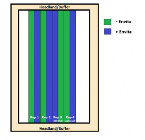 - Each treatment to be one or more widths of Envita applicator – e.g. planter or sprayer. Must be as wide or wider than combine header.