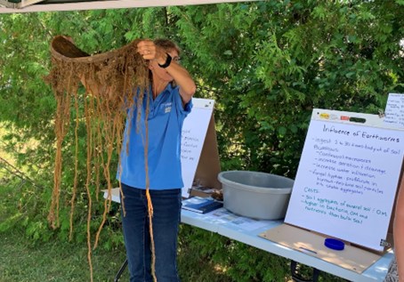 The small but mighty earthworm plays an important role in helping maintain soil health. Christine Brown, Field Crops Sustainability Specialist, used various visual aids, such as a resin casting of worm burrows, showing how effective earthworms are at helping to maintain soil structure. Earthworms are excellent soil engineers, burrowing through the soil to increase porosity and water infiltration. They feed on decomposed plant material and microorganisms in the soil which, once digested, makes essential nutrients available for plant uptake. Like soil microbes, no-till and other conservation practices that help to increase soil organic matter create the ideal habitat for earthworms to live, burrow, and cycle nutrients.