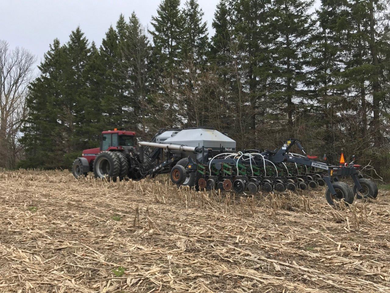 It was then that we found a Flexicoil 8000 20’ toolbar with older Great Plains planter units that had been used for soybeans.  As the toolbar wasn’t originally designed for planter units, we modified some support members to be able to mount the planter units to plant 12” apart in between the corn rows, and leaving 18” where the old corn row was.  This has helped get the disc openers away from the corn stalks, and a more consistent establishment.
