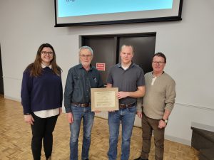2022 LSCIA Outstanding Farmer Award Presentation – L to R Emily Febrey, St. Clair Region Conservation Authority; Award Recipients – Brad & Jordan Douglas; Clark Aitken, Parkland Farms