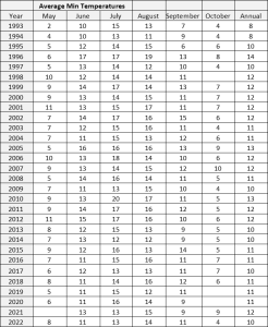 I would like to extend a huge ‘Thank You’ to Tom Kennedy, who has been collecting weather data at the same Holland Centre location for 29 years. He contributes annually to our regular data collection efforts, and this year brought in historical data records as well. Take a look at the charts below to see what he has experienced in terms of weather changes over the years.