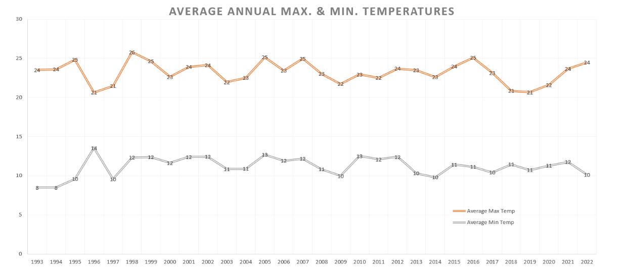 Average maximum and minimum temperatures for each year, measured in degrees Celsius.