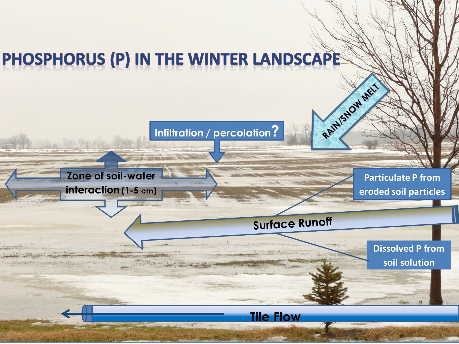 Every winter season is different and there are wide range of winter conditions across the province. Research studying the fate of nutrients has resulted in more measurements during the winter and snow melt seasons. Nutrient movement from soils in winter is often higher than all the other times of the year combined. Figure 1: Phosphorus in the Winter Landscape, shows the potential fate of P when exposed to melting snow combined with rain and frozen or partially frozen soils. Water can’t infiltrate or percolate a frozen soil, which results in overland flow. Under these conditions, the soil within the top 5 cm (2 inches) is unfrozen and saturated (mud) and can move easily with water as sheet or rill erosion. Phosphorus in this layer can dissolve into the soil solution and leave the field as dissolved P. When soil phosphorus levels are high, the risk of dissolved P (also known as soluble P) loss from the field is increased.
