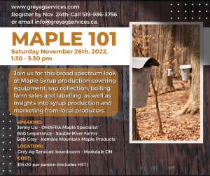This hybrid course will cover equipment, sap collection, boiling, farm sales and labelling, as well as insights into syrup production and marketing from local producers. Presenters include OMAFRA Maple Specialist Jenny Liu, as well as Bob Lesperance of Sauble River Farms and Bob Gray of Kemble Mountain Maple Products. Please register by November 24th by emailing info@greyagservices.ca or calling 519-986-3756.