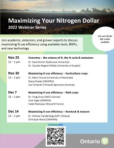 OMAFRA will be hosting a 4-part webinar series entitled “Maximizing your Nitrogen Dollar” to take an in-depth look at Nitrogen. Join academic, extension, and grower experts to discuss maximizing N use efficiency using available tools, BMPs, and new technology.