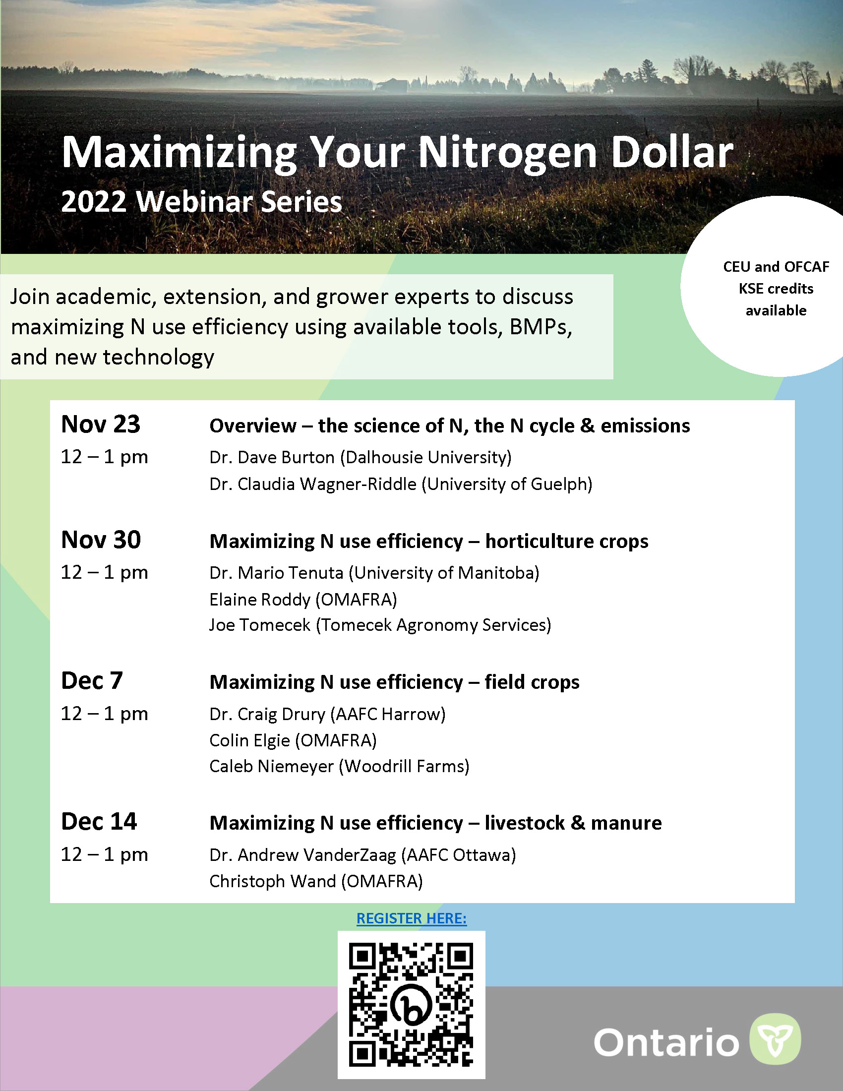 More details are included on the poster below. Please register using the QR code provided, or at the link here: https://www.eventbrite.ca/e/maximizing-your-nitrogen-dollar-2022-webinar-series-tickets-460828549597