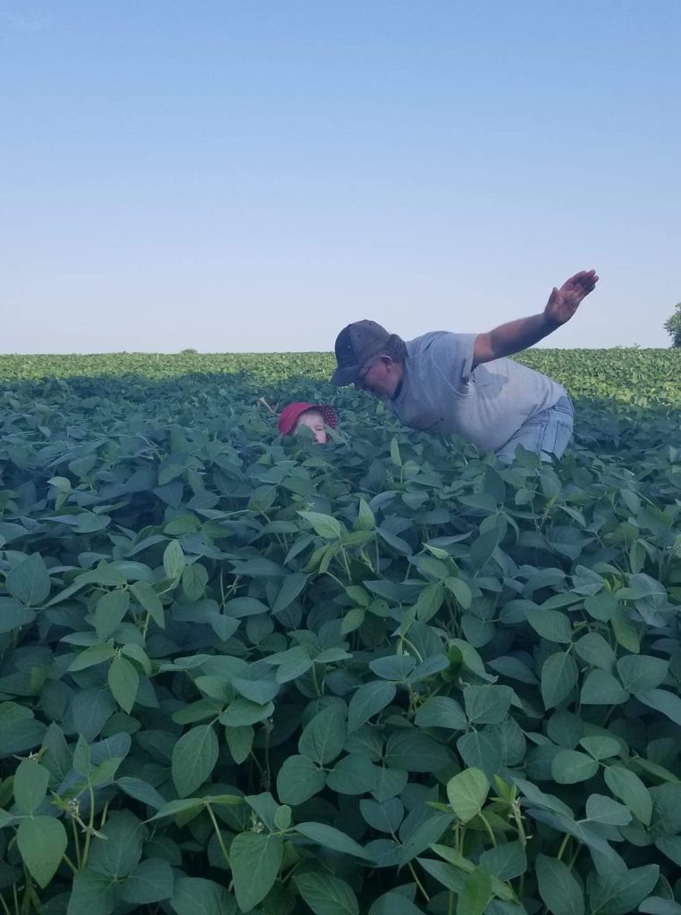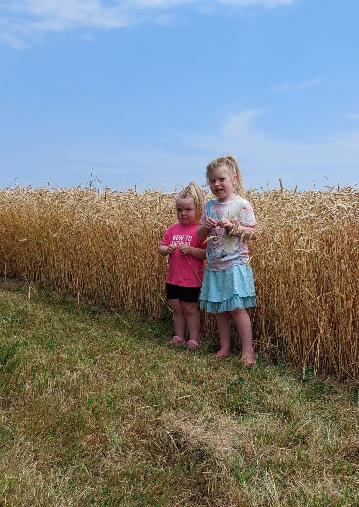Terry checking the height of the beans with his granddaughter. His ‘Crop Barometer!’ They check the field in the same spot at the same time each year.
