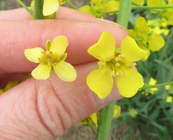 Canola plants take up nitrogen and sulphur in a ratio of approximately 5:1, and high rates of nitrogen applied without sulphur can result in very poor crop performance. If deficiency symptoms are noted, sulphur can be applied as a rescue treatment prior to pod development. However, the clearest visual symptom is small, pale coloured flowers (see photo) and by the time they are observed yield loss may have already occurred. Other symptoms, such as cupped, purple leaves maybe difficult to correctly identify because purple colouring is a common symptom of various stresses and deficiencies.