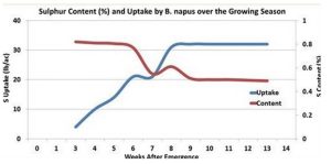 Sulphur is rapidly taken up during the first few weeks of growth, as shown in research conducted in Canada on spring canola (see graph). Because it is the same species as spring canola, winter canola has the same high requirement for sulphur in the early growth stages.