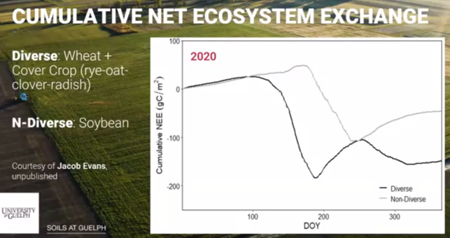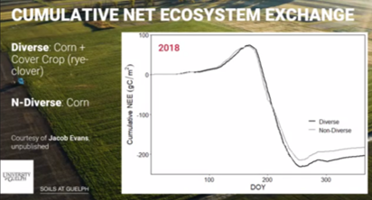 Looking at the balance between carbon in and carbon out of the system in relation to crop rotations, we can see the impact of diverse vs. non-diverse rotation systems. Cam went on to show an example of a diverse system of corn with rye-clover covercrop vs. a corn only system.