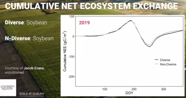 Looking at soybeans as an example, data shows there will be less carbon capture over the season compared to corn due to less biomass in soybeans.