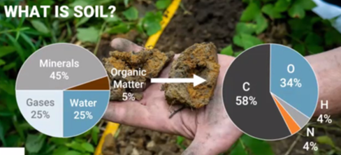 To understand how soil carbon sequestration works, we first need to understand soil composition. Soil is primarily made up of 45% minerals, 25% gasses, 25% water and 5% organic matter. The soil organic matter (SOM) is where we find carbon, amounting to roughly 58% carbon making up that organic matter portion. While we can’t control the mineral fraction of the soil composition, we can control pore space and soil organic matter to a certain extent.