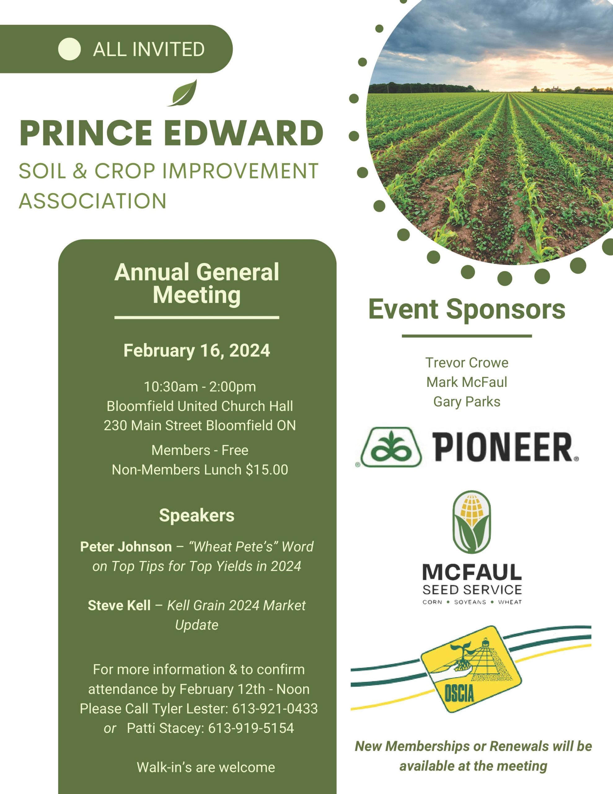 Bloomfield United Church Hall 272 Main Street NULL, Bloomfield, K0K1G0, 9Prince Edward SCIA AGM February 16, 2024 10:30 AM—2:00 PM Bloomfield United Church Hall 230 Main St, Bloomfield, ON Members—Free Non–members Lunch $15.00 Speakers Peter Johnson—"Wheat Pete's" Word on Top Tips for Top Yields in 2024 Steve Kell—Kell Grain 2024 Market Update For more information and to confirm attendance by February 12—Noon please call Tyler […]